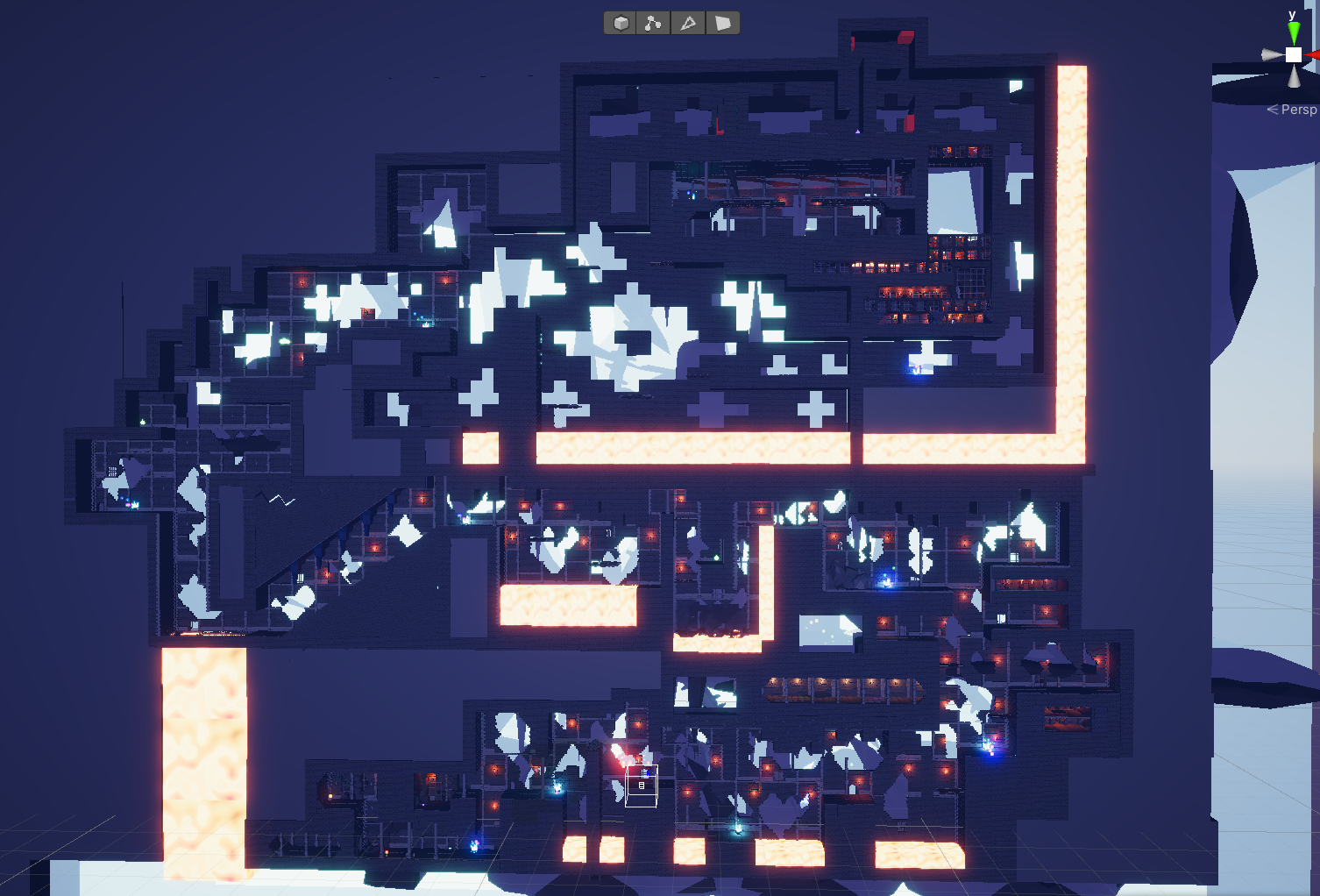 The image on the left is the level that I created for Velocitas. The original version of the level varied drastically to how it is set out now. However this final design was achieved through conducting extensive playtesting sessions and collating feedback based on player patterns and activity in the level. The final result is a level that is still difficult for the player to complete. However it is completable and is definitely a challenge for anyone who is familiar with the mechanics of Velocitas. I definitely learnt a lot from creating this level and have used my experience with this level design to help create better and more engaging level designs in projects that I undertook after completing development on Velocitas.